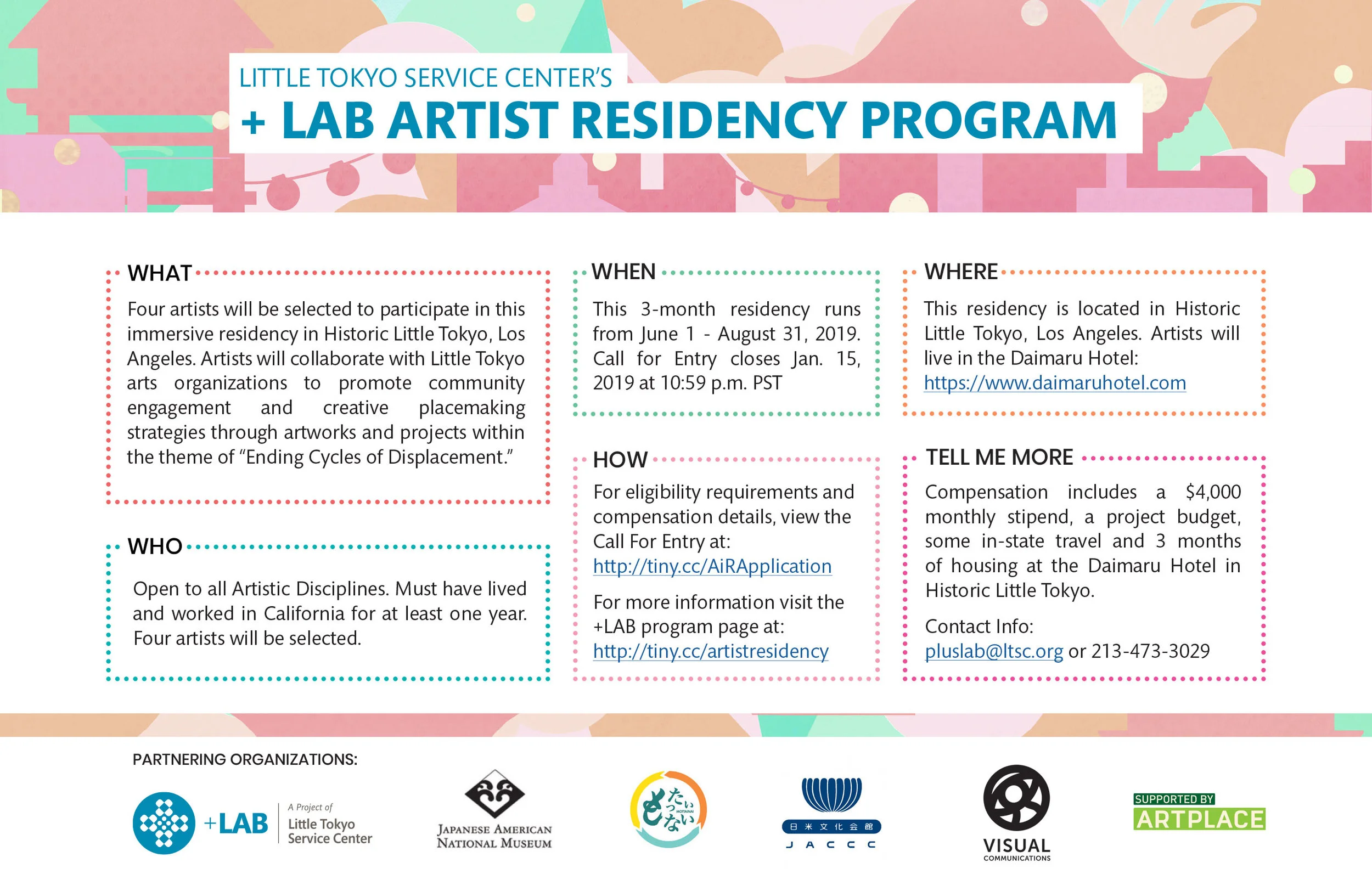 Little Tokyo Service Center (LTSC) is excited to announce its 2019 +LAB Artist Residency Program. A Call for Entry on the CAFÉ site is now active for artists who live and work in California. The application opens Nov. 16, 2018 and closes Jan. 22, 2019 10:59 PM PT.